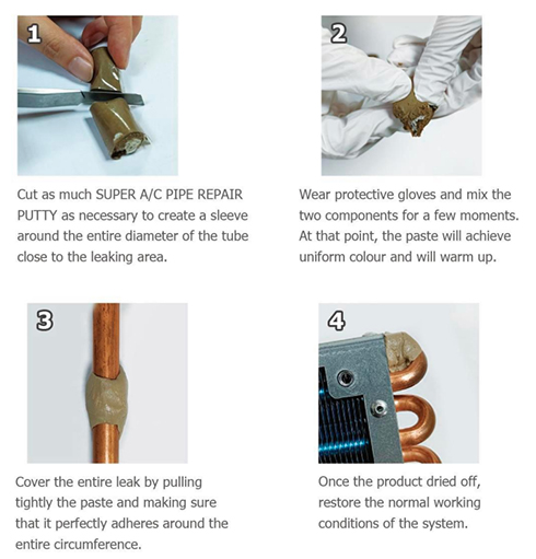 A/C pipe repair putty is a ready-to-use putty leak stopper specially designed for quick and easy application, making it the ideal solution for urgent repairs. It effectively seals leaks up to 5 mm in diameter on copper and aluminum components, and the repaired surface can be easily sanded or removed afterward. This mini version is perfect for automotive air conditioning and refrigeration systems, providing fast, reliable emergency fixes whenever you need them.