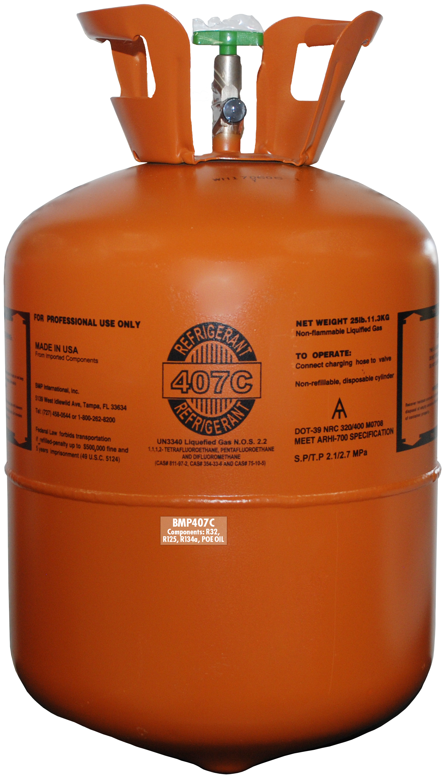 BMP407C is a blend of R-32, R-25 and R-134a with 5% POE oil included, which acts as a lubricant agent. It has similar properties to R-22 in air conditioning equipment, being the closest property match to R-22 in air conditioning retrofit project compared to other blends. BMP407C is used in medium temperature R-22 refrigeration systems. Systems retrofitted from R-22 systems would need the residual oil flushed with POE. BMP407C is non toxic and non flammable, meeting the highest A1 Classification.
